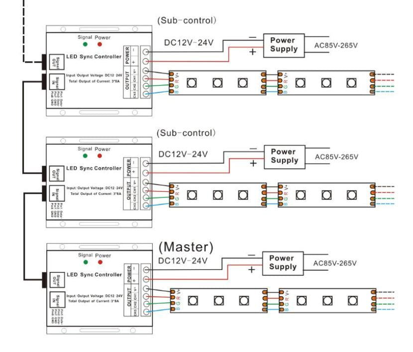 - Synchronization Function: Multiple controllers can work in sync when connected via network cable (RJ45 connector), with a maximum cable distance of 80 meters between ports